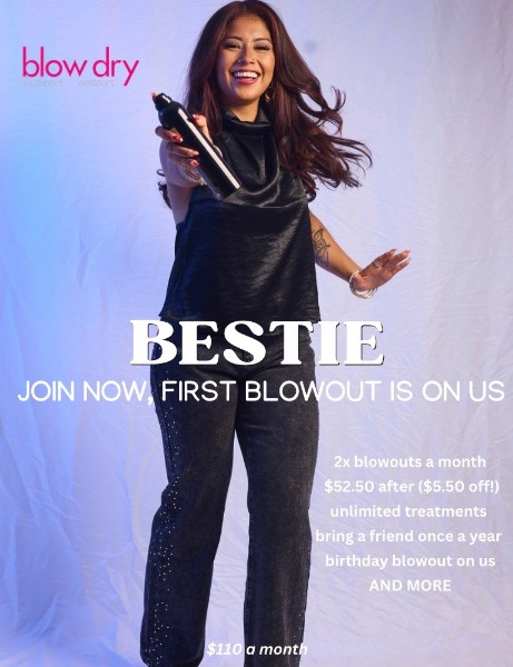 Become a Blow Dry Bestie with an exclusive membership*: For $110 per month, enjoy two blowouts plus a $5.50 discount on additional blowouts and 20% off retail purchases, unlimited deep conditioning treatments. Also enjoy a complimentary blowout the month of your birthday, and 1x per year bring a friend with you for a complimentary blowout!